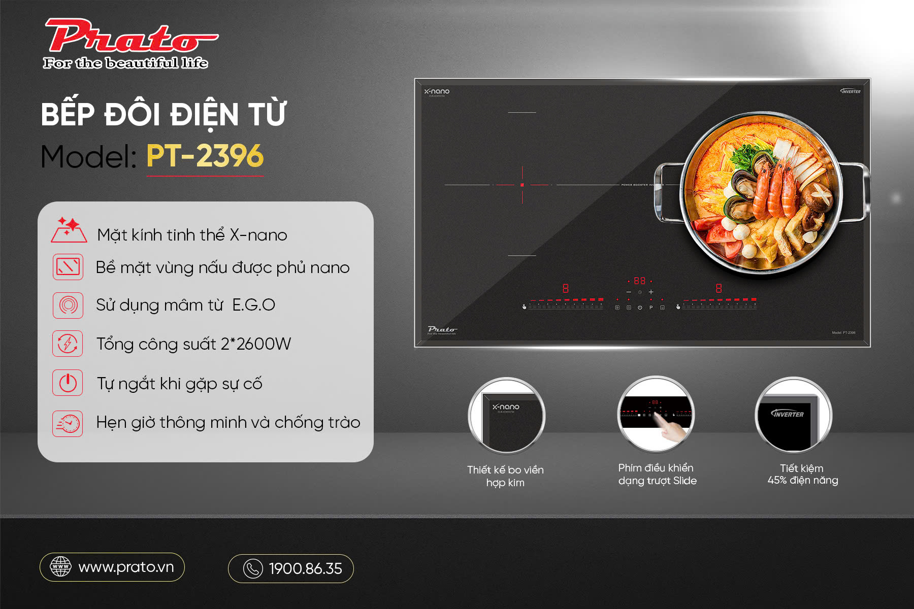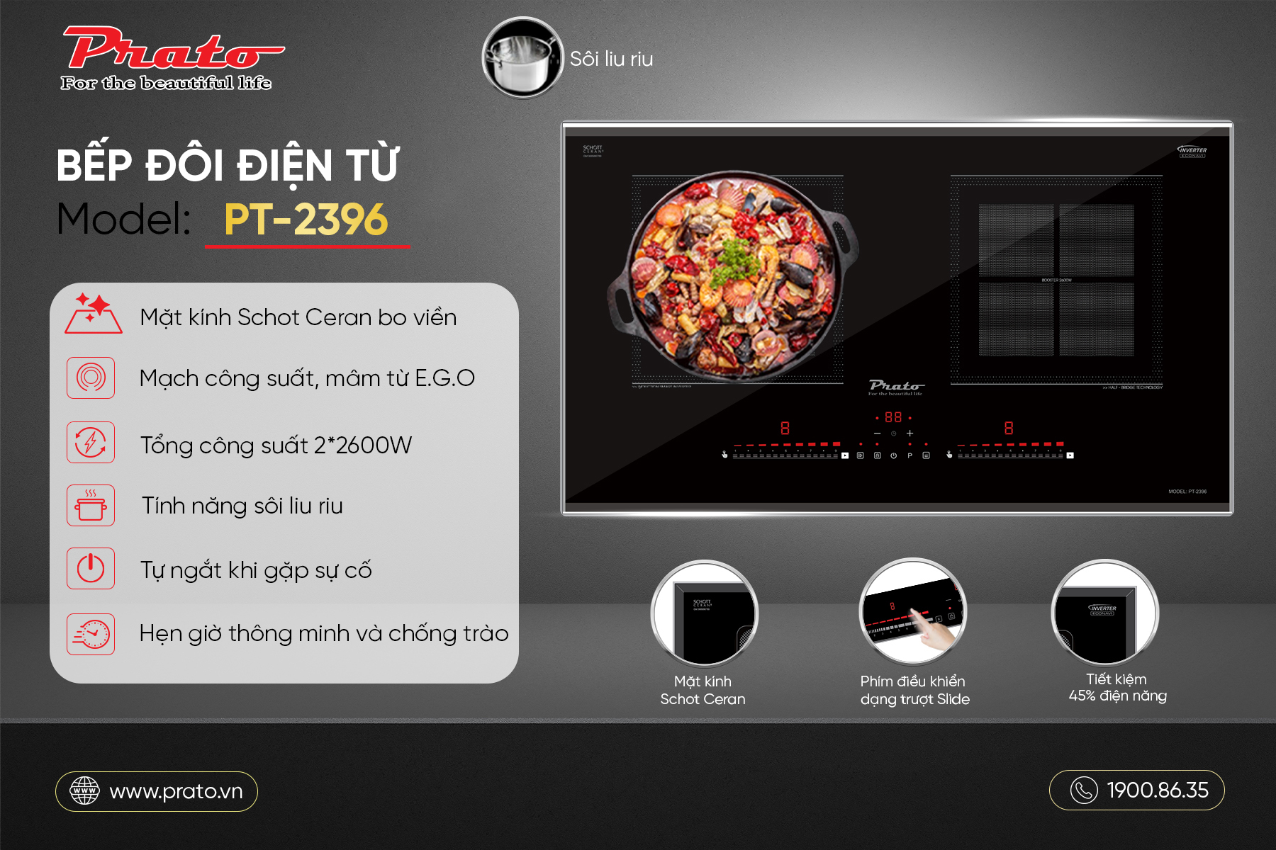 Với thiết kế tinh tế, mặt kính siêu bền, công nghệ Inverter tiết kiệm điện và hàng loạt tính năng an toàn, Prato PT-2396 là một trong những dòng bếp từ đôi đáng mua nhất hiện nay.