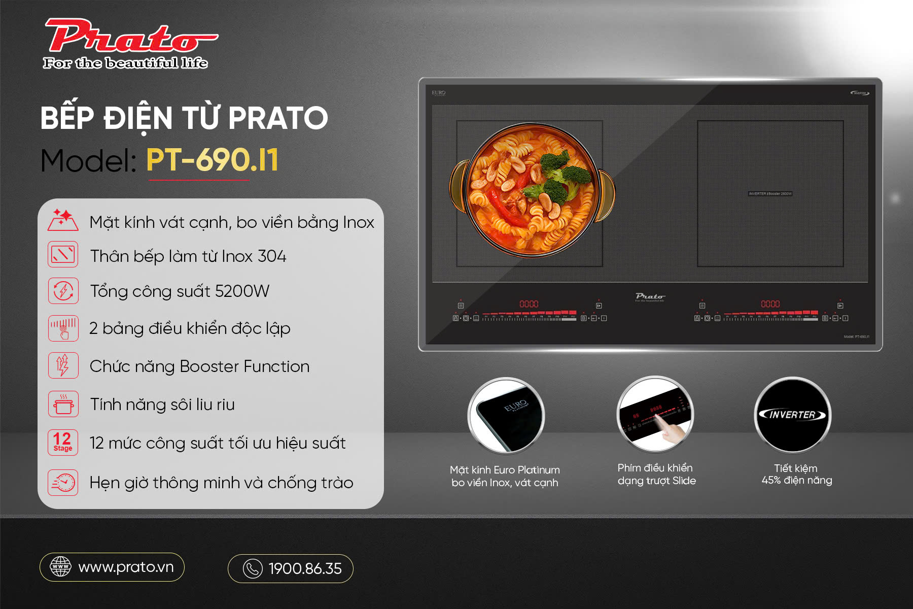 Bếp từ đôi Prato PT-690.I1 là lựa chọn phù hợp cho những gia đình tìm kiếm một thiết bị nấu nướng hiện đại, tiết kiệm điện và bền bỉ lâu dài.
