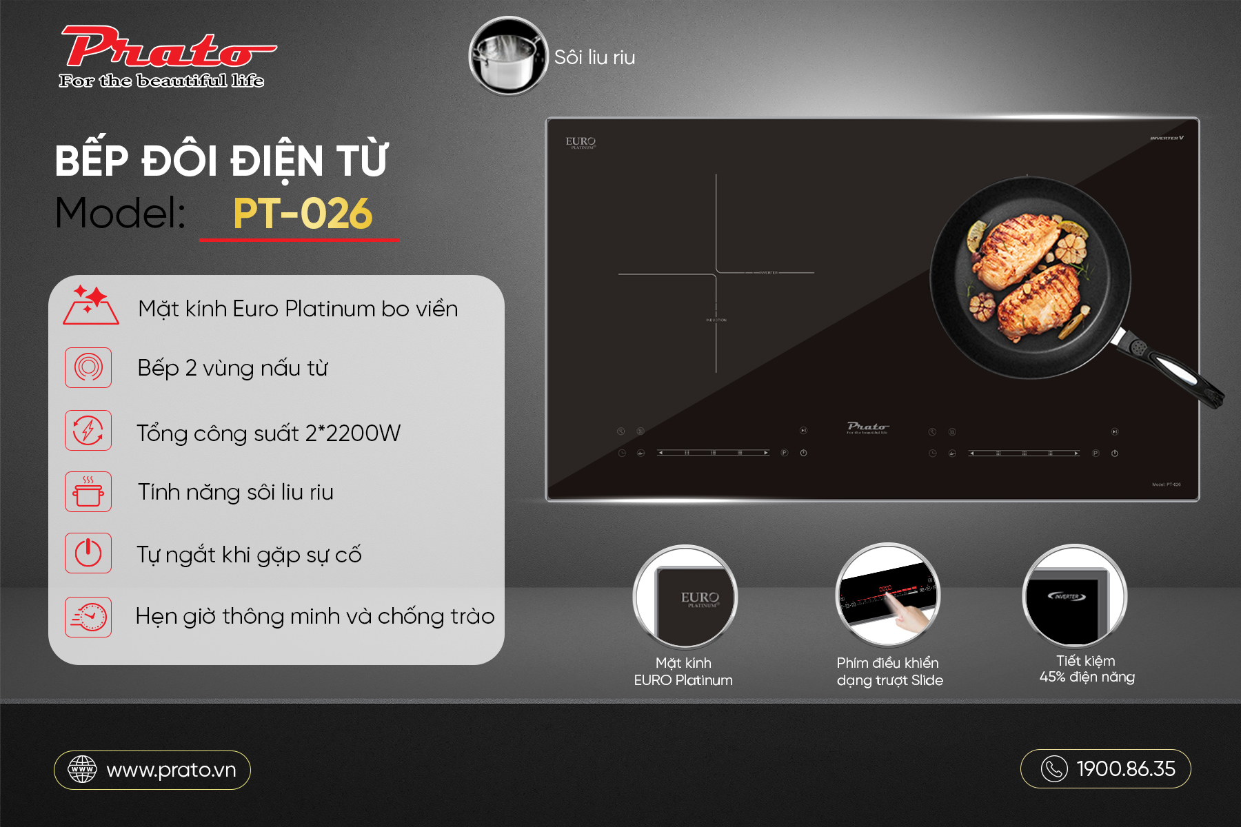 Bếp Từ Đôi Prato PT-026 – Giải Pháp Nấu Ăn Hiện Đại, Tiết Kiệm Và An ToànBếp từ đôi Prato PT-026 là dòng bếp từ hiện đại được phát triển nhằm đáp ứng nhu cầu nấu nướng nhanh, tiết kiệm điện và đảm bảo an toàn cho gia đình Việt. Sản phẩm kết hợp thiết kế sang trọng cùng công nghệ tiết kiệm năng lượng tiên tiến, mang lại trải nghiệm nấu ăn tiện nghi và bền bỉ. Thiết kế mặt kính EURO Platinum sang trọng và bền bỉPrato PT-026 sử dụng kính EURO Platinum cao cấp với: