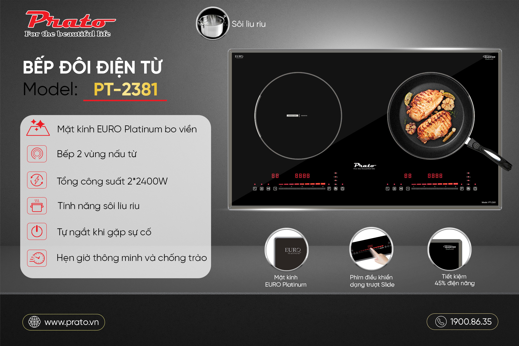 Bếp từ Prato PT-2381 là giải pháp hoàn hảo cho căn bếp hiện đại, kết hợp sự tiện nghi, an toàn và tiết kiệm điện năng. Thiết kế tinh tế với mặt kính EURO Platinum chịu nhiệt 1000°C, viền hợp kim nhôm cao cấp cùng các tính năng thông minh như Booster Function, chế độ Warm và công nghệ Inverter Dualcore, giúp rút ngắn thời gian nấu và nâng cao trải nghiệm nấu ăn hàng ngày.